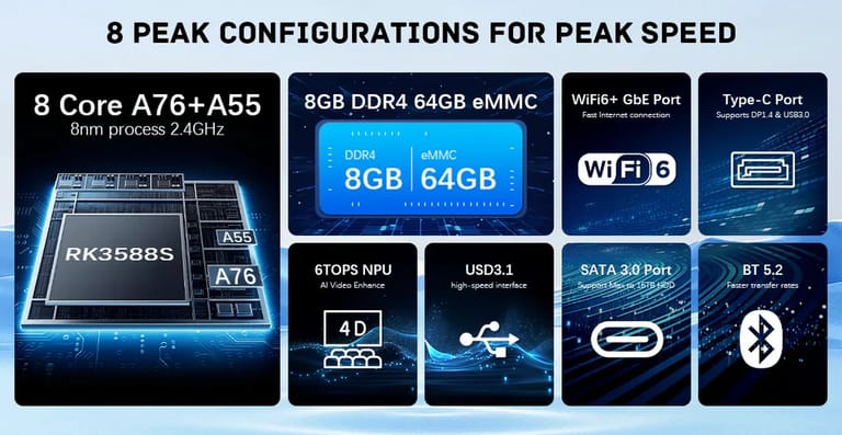 Super Console X5 Pro ใช้ชิป RK3588s เป็น SoC อเนกประสงค์สถาปัตยกรรม ARM ประกอบด้วย Quad-core Cortex-A76 (แกนใหญ่) และ Quad-core Cortex-A55 (แกนเล็ก) พร้อม GPU G610 MP4 ที่ช่วยให้การประมวลผลกราฟิกซับซ้อนเป็นไปอย่างราบรื่น GPU 3D ในตัวรองรับ OpenGLES 1.1, 2.0, 3.2, OpenCL 2.2 และ Vulkan1.2 มีฮาร์ดแวร์ 2D พิเศษพร้อม MMU ช่วยเพิ่มประสิทธิภาพการแสดงผลและการทำงานให้ลื่นไหล NPU 6 TOPs รองรับ AI หลากหลายรูปแบบ ทำให้สามารถประมวลผล AI แบบออฟไลน์ วิเคราะห์วิดีโอสตรีมซับซ้อน และใช้งานอื่น ๆ ได้