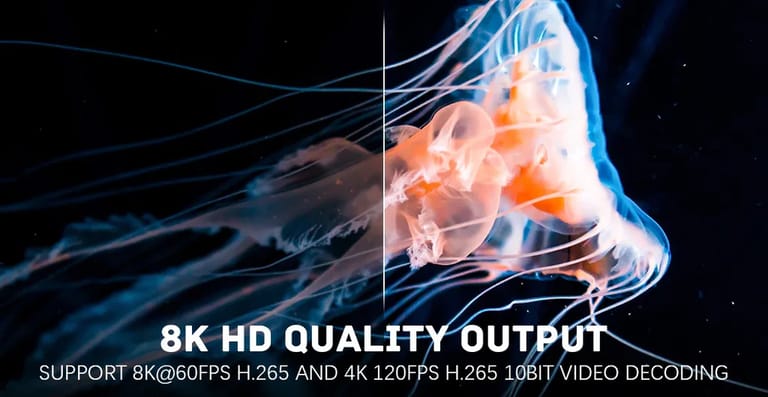 สัมผัสความคมชัดระดับ Ultra HD 8K ด้วยกล่องทีวีที่ทรงพลัง เพลิดเพลินกับภาพที่ชัดเจนและการเล่น 8K ที่ 60 fps อย่างราบรื่น ด้วยความสามารถในการถอดรหัสวิดีโอขั้นสูง